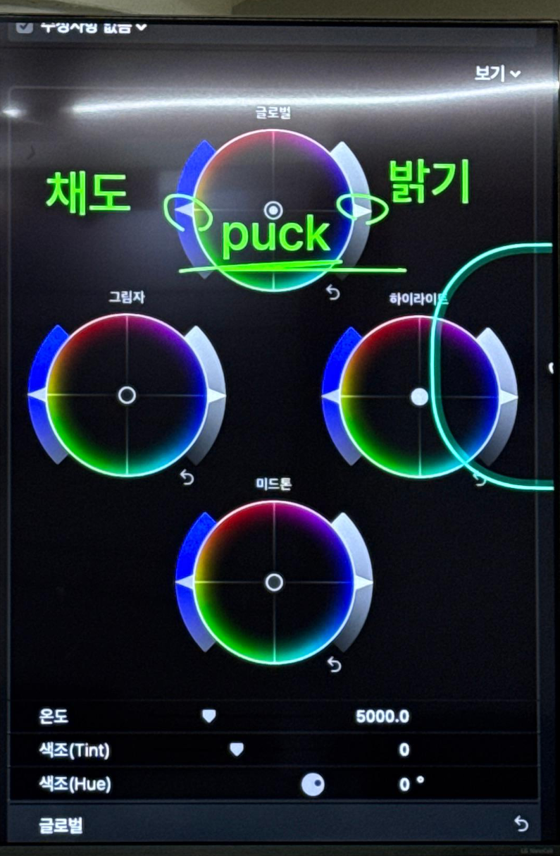 2. 휠의 온도를 조절해서 빨간색, 파란색 균형 맞추고 -> tint를 조절해서 초록색을 맞춘 결과