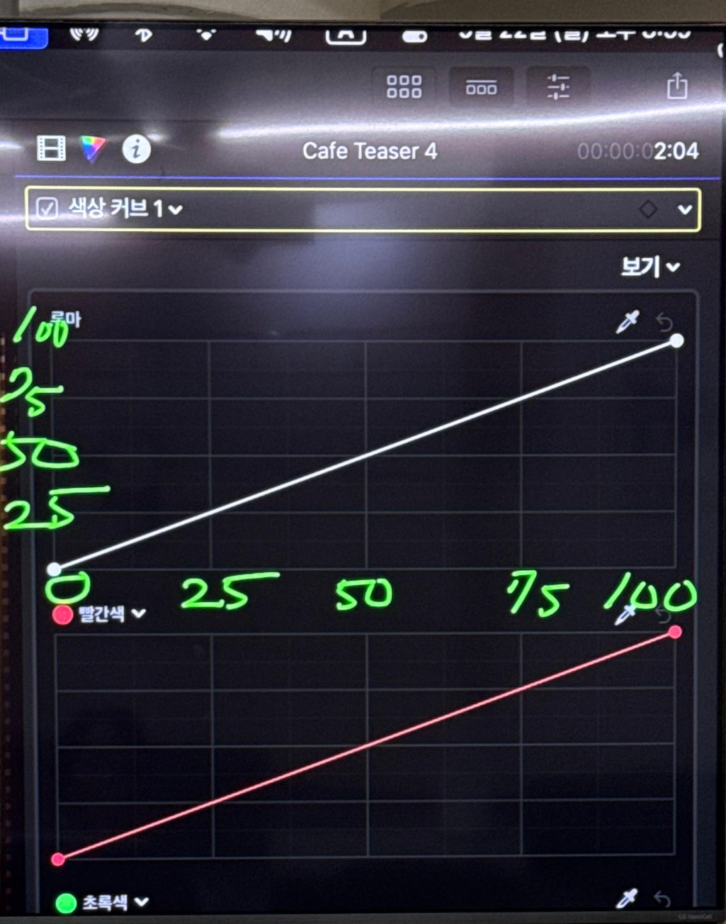 파형에서 100이 넘은 부분만 낮아짐 but 채도도 함께 부자연스러워짐 so 밝은 부분 채도 조정해야