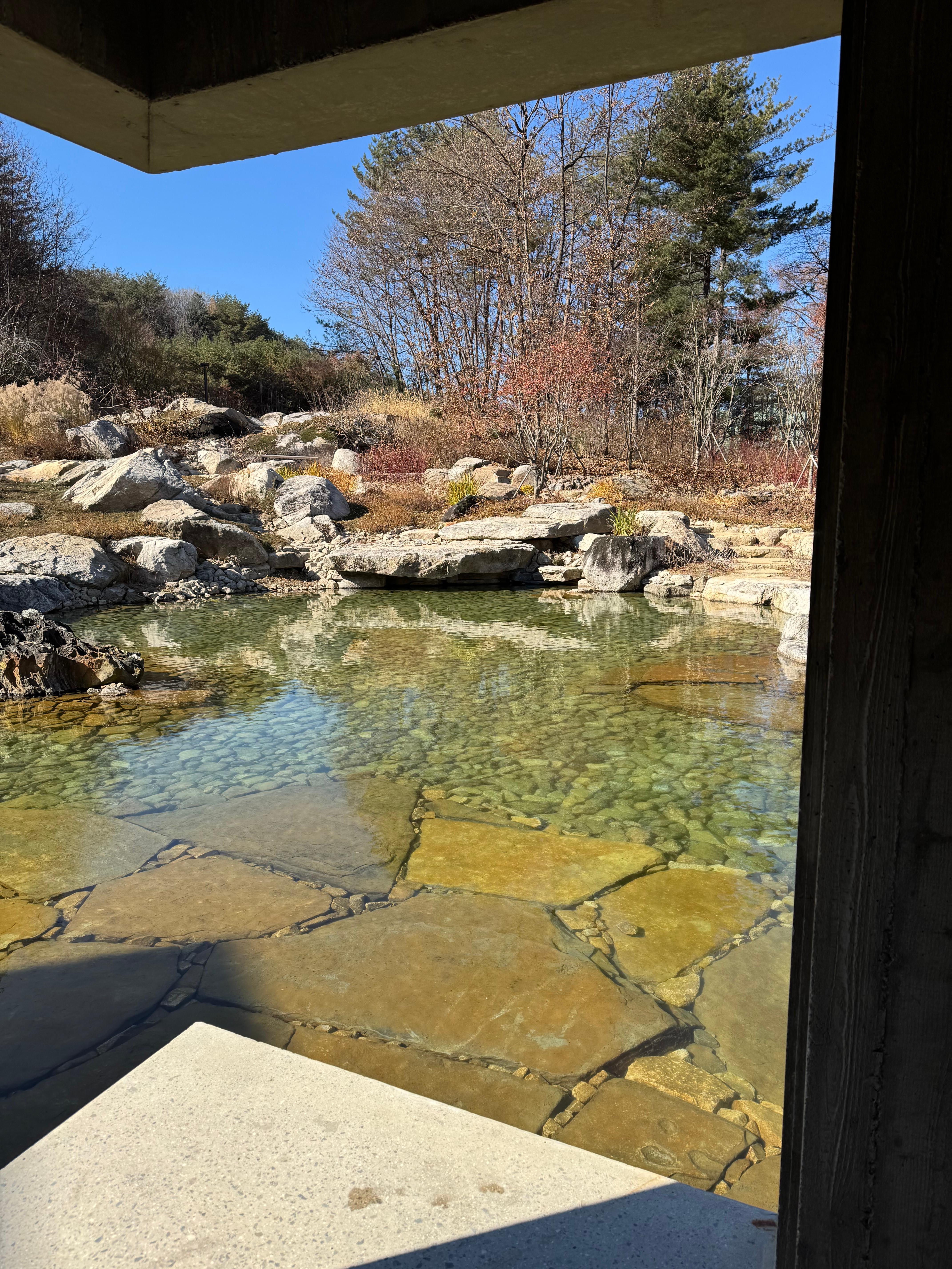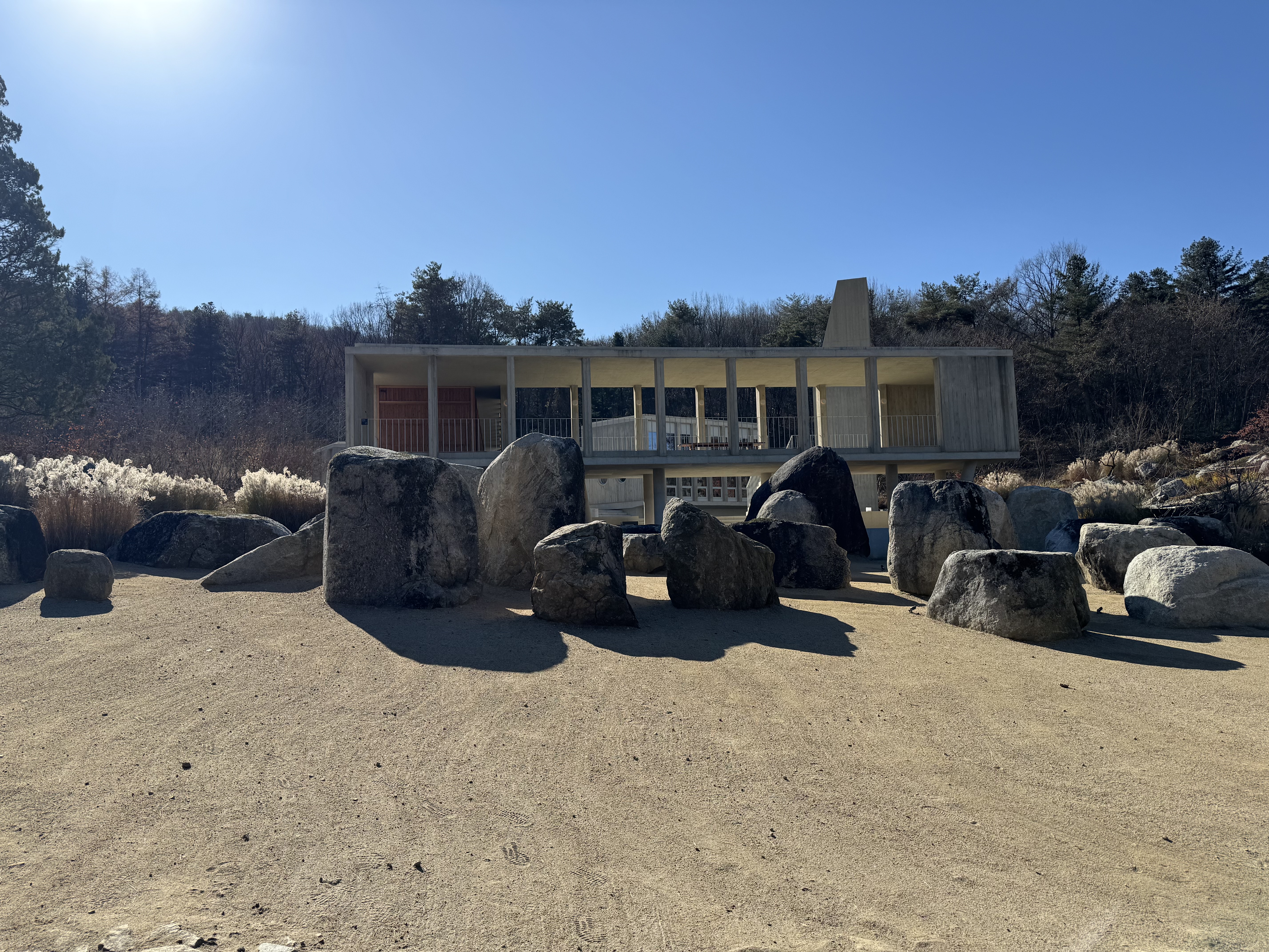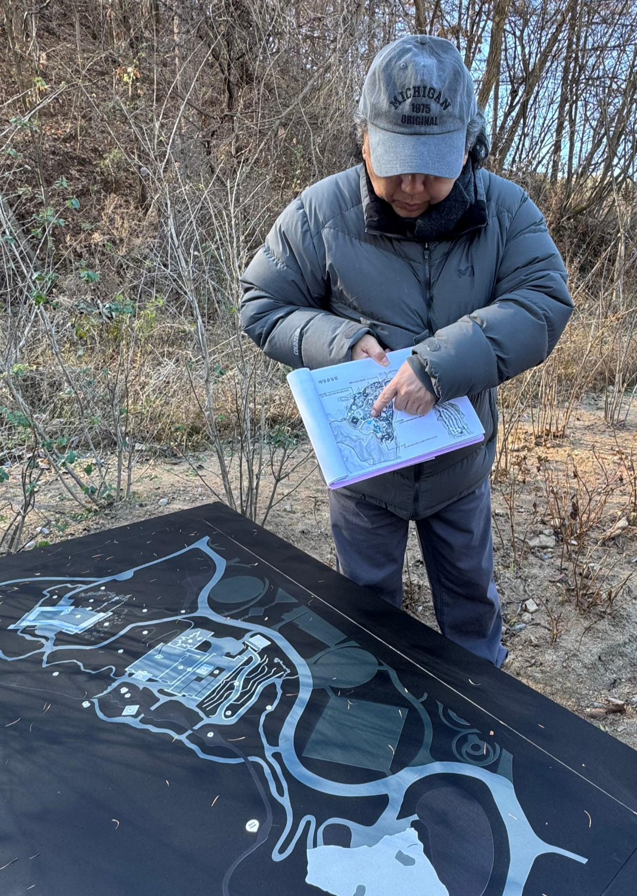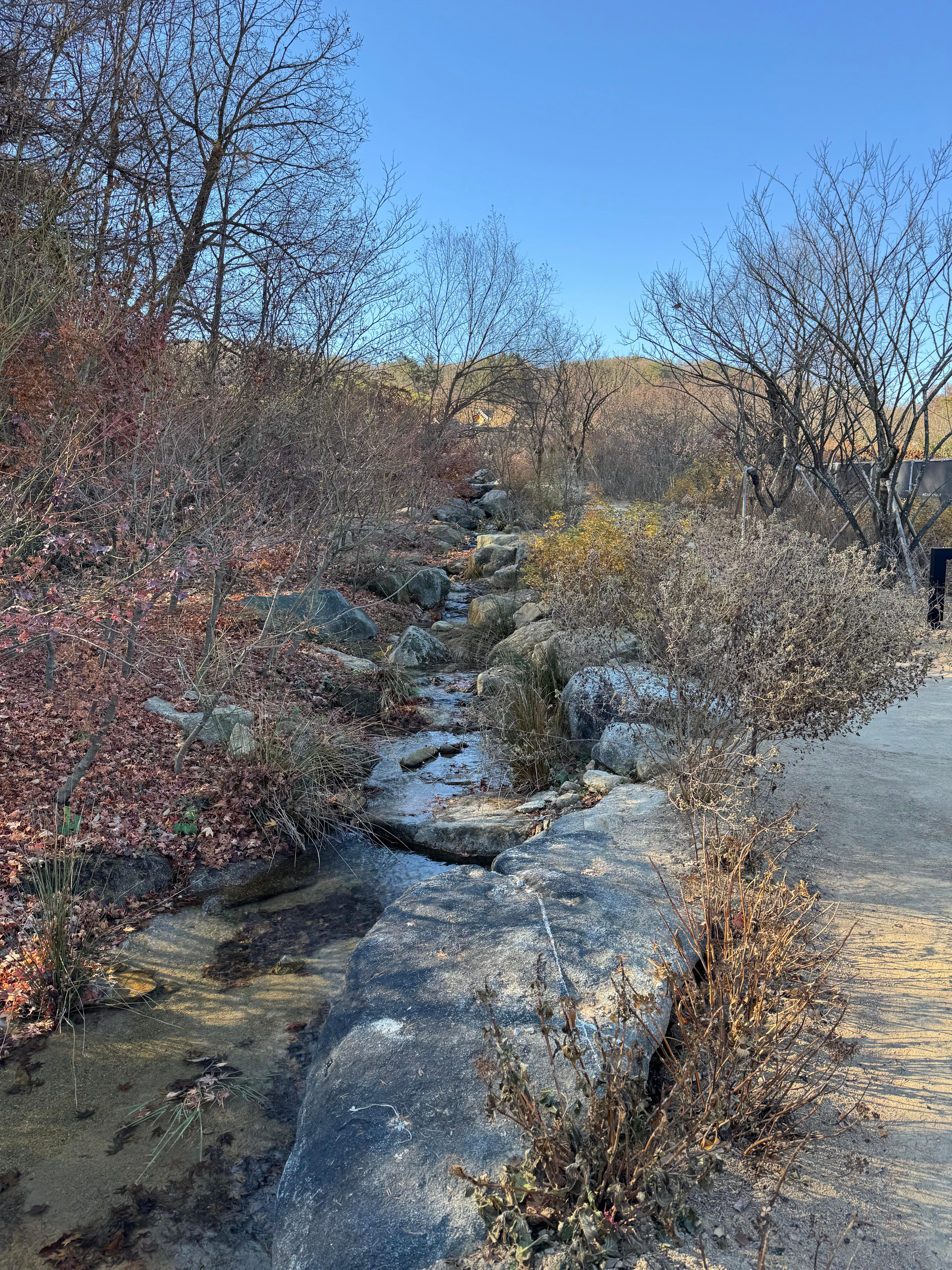 물길을 끌어 직접을 돌을 쌓아 만든 400m 계류가 계속 이어지고 있다. 그 오른쪽에는 공사장 가림막이 있는데 한칸한칸이 류재용대표님이 추앙하는 니체 저서 글귀가 모두 다르게 발췌되어 적혀있다.