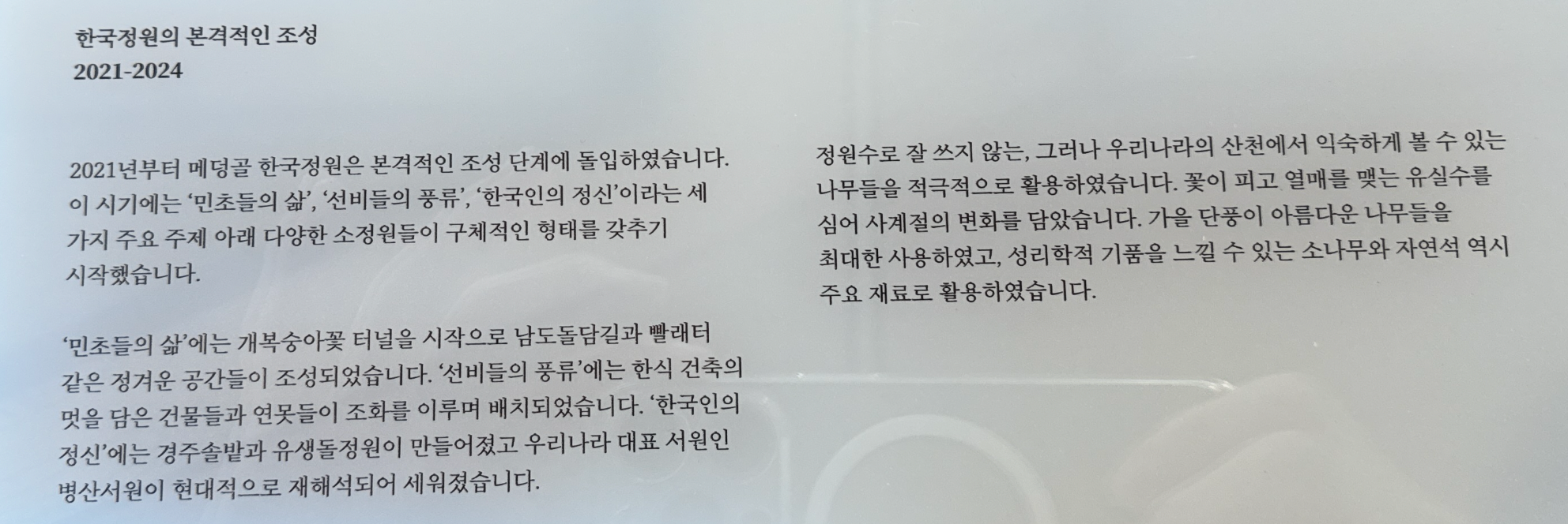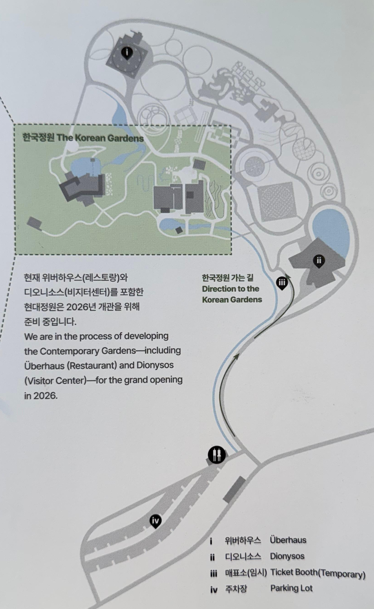 현재도 조성공사가 계속되고 있고 오픈된 정원은 한국정원이다.